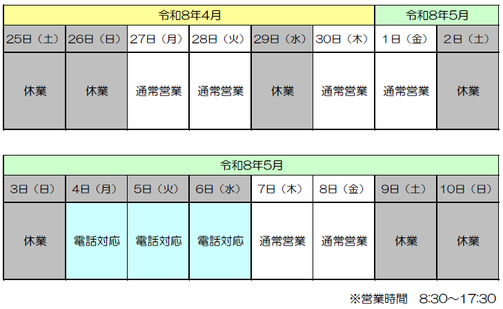 さて、大型連休中における福祉ビジネス部のサポート体制につきましては、誠に勝手ながら